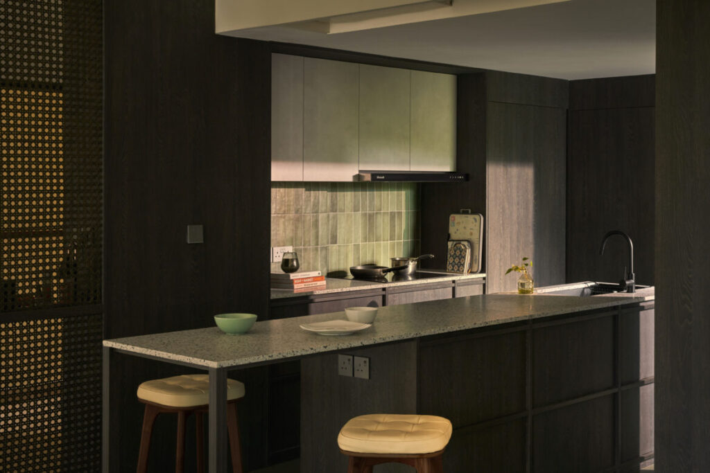 In the living room, grey stuccoed walls juxtapose with a recessed terracotta accent wall and cream travertine floor tiles exude understated elegance. Anchored in the foyer is a painting by Chua Ek Kay, and Kelvin referenced its green brush strokes for implementation in the kitchen: green backsplash, green terrazzo island and green floor tiles. Though subtle in application, together, they create a cohesive design language.