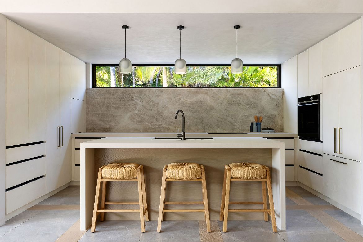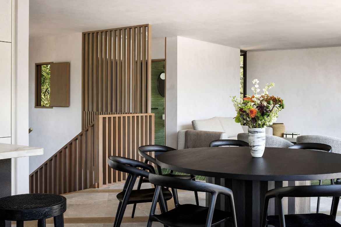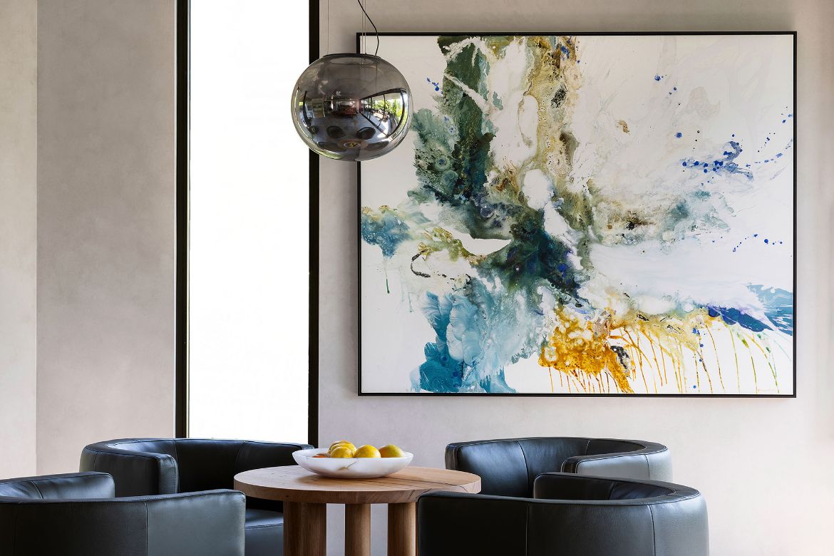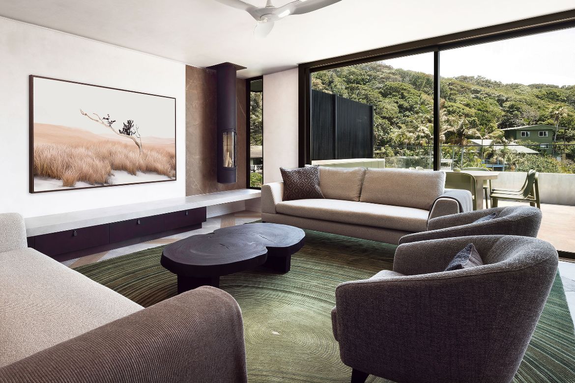 Art brings another layer of local connection. Works by Rikki Kasso – loose black-and-white “almost watercolor washes that bring a vintage beach vibe” – set a relaxed tone, while pieces by environmental artist Janet Laurence, painter Michael Whiteread, and works from Melbourne-based photographer Rebeckah Stuart and Sydney-based Zoe Sernack enrich the dialogue between landscape and interior. “We worked with smaller Byron Bay galleries but also looked into Saatchi Art for both high-end and more affordable pieces,” she says.