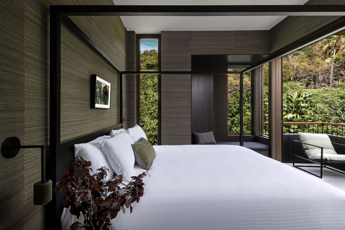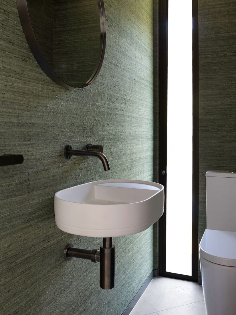 Starfall has a youthful, airy quality with honey oak and a rooftop pool and lounge, while Moonrise is sited higher with panoramic bay views and has a moodier aesthetic. “I love the primary bedroom in [Moonrise]. It has microcement walls and this rich green Phillip Jeffries grasscloth.”