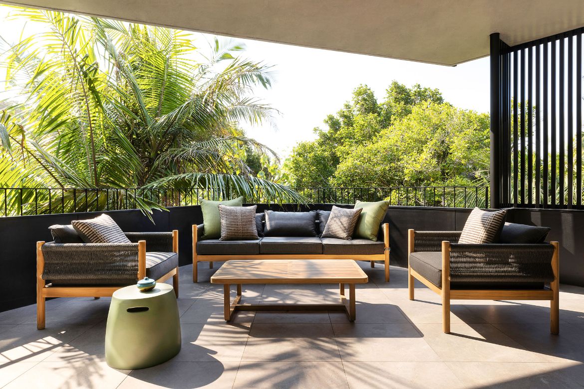 Outside, pieces from Globe West, including the Ossa Lunar Dining Table, Reef Chair, and Sonoma Sun Lounger, provide plenty of spots to relax and gather, whether sitting poolside or enjoying a drink on the patio.