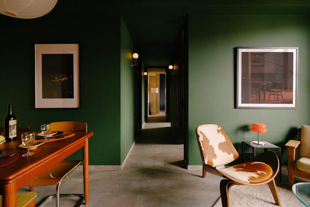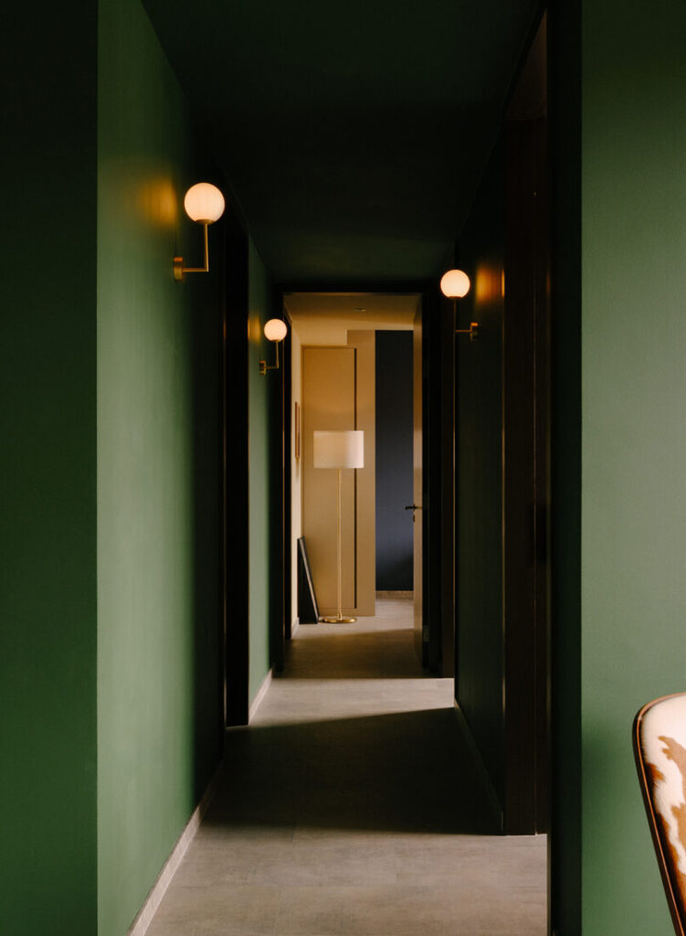 Circulation is treated with equal attention. The corridor leading to the bedrooms is wrapped in a deep green, gently shifting the mood from shared to private. Wall lights by Verde Lights introduce a steady rhythm, while framed artworks guide movement forward, turning what might have been a purely functional passage into a calm transition.