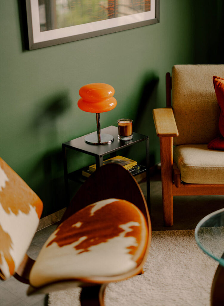 The dining area sits at the centre of the home. Informed by mid-century modern sensibilities, a restored Danish extendable table by Copan.co anchors the space, paired with Niels Møller Model 77 chairs in green. Two intentionally mismatched chairs — one red, one orange — introduce a relaxed note, subtly reflecting the homeowners’ preference for character over uniformity. Above, a Hay pendant provides an even wash of light, while an Akari 1A table lamp nearby softens the atmosphere during quieter moments.