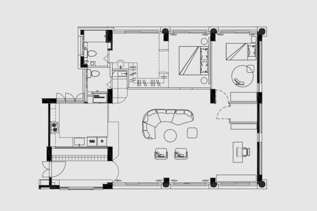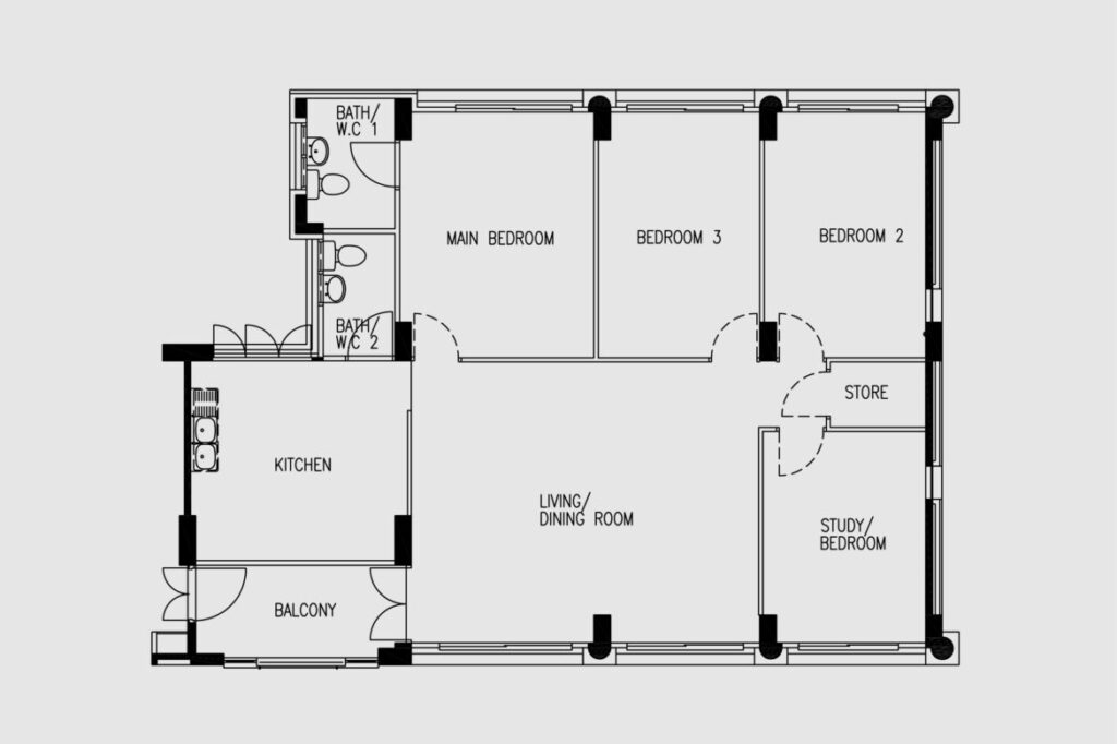 The original layout, however, posed challenges. “The unit was relatively cramped, especially at the foyer, which was important as it sets the first impression of the home,” Siang Wee explains. By pushing back the wall between the foyer and kitchen, the designers created room for a welcoming settee and introduced a cobalt-blue framed window that draws the eye deeper into the home. To balance the shift, the common bathroom wall was recessed to neatly accommodate tall storage and the fridge, improving the flow in the kitchen.