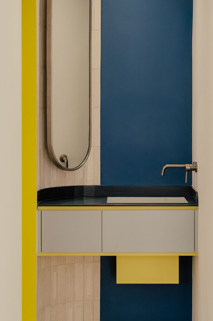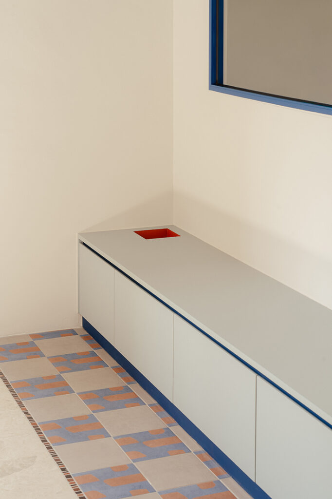 Rather than relying on partitions, transitions throughout the home are guided through materials. Tiling and mosaic details sweep across the floors in gentle curves and clean lines, subtly signalling shifts between spaces. In the foyer, textured blue tiles meet rustic mosaics in wine, terracotta and burgundy, and align with a structural column that becomes a visual anchor.