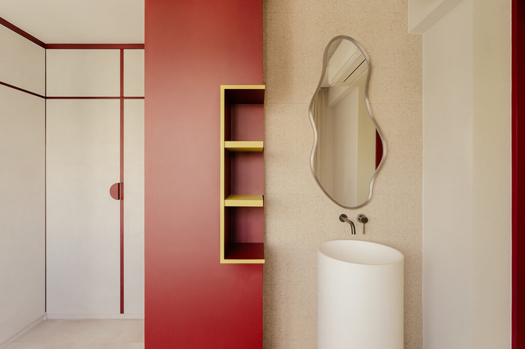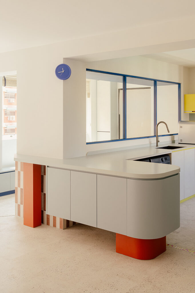 The kitchen and living area naturally sit at the centre of family life. Frost blue cabinetry is layered with deep red and lime green accents, forming a lively backdrop for meals, play and conversation. “The kitchen carries the strongest expression of primary colours, serving as the feature backdrop of the conversational living room,” says Siang Wee. Positioned this way, it supports the homeowners’ wish for a home that encourages interaction and shared time.