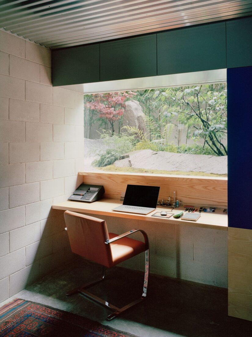 Clerestory windows bring light into the main upper space, with bespoke timber storage cabinets and bookcases used to break up the apertures. It is a clever way of dealing with the problem of overlooking neighbours in this dense location, but, most importantly, it leads to what is perhaps the climax of the project – a sensitively framed garden that ties together the atmospherically contrasting upper and lower levels. With the garden evoking a ‘borrowed landscape’ aesthetic, it is utterly appropriate that Langston-Jones has chosen to restrict and curate visual interaction with it. “The framing of the view makes it that much more intense and precious,” he adds.