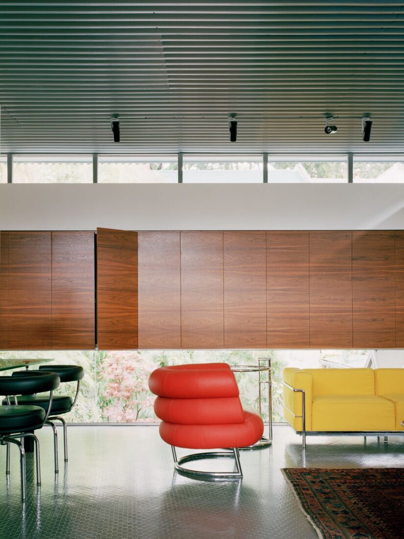 The angled subdivision pattern of the street – which has the houses stepped by 15 degrees – provides the first intriguing image of the project. Jutting out slightly, they subtly yet invitingly catch the eye as one moves closer. “It’s a tight site,” notes Langston-Jones, explaining that, “it’s an awkward shape and slopes from front to back.” The level change is a remarkable two metres across each of the compact 80-square-metre houses, while other significant constraints included council dictates on flood zoning, setback and scale.