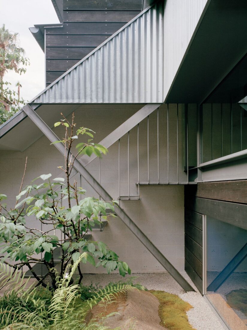 Naturally, it is then the upper level that takes on the more public duties of living area and kitchen. In these main ‘served’ spaces, the material palette is deliberately different – corrugated zinc ceilings and a concrete floor create an atmosphere of openness as opposed to the intimacy of downstairs. Meanwhile, transitioning between the two levels involves a beautiful little moment of overlooking the street, thanks to the tightly fitted, cantilevered stairs.
