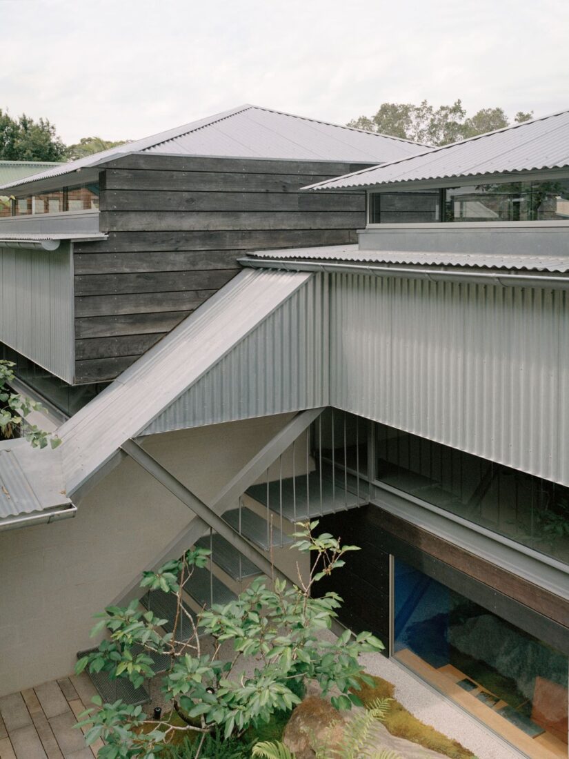 The sense of architectural rigour is captured in the initial encounter with the Zen garden on the same level, which caters to the more private spaces of each house. Due to the sloping site, the windowsill levels of the bedroom and office rooms here are fitted precisely to meet the ground plane of the garden. It is a quietly thoughtful and magical touch that embeds the houses in the earth, creating a sense of assured peace and sturdiness.