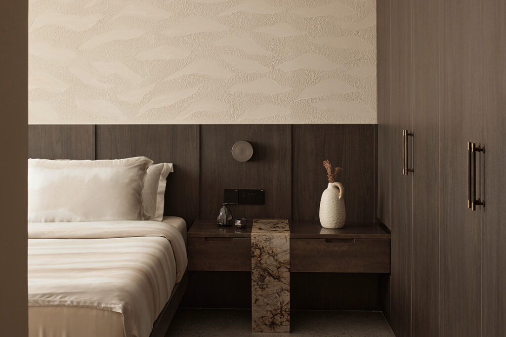 A muted terracotta rug anchors the living zone beneath a low sofa, while the kitchen continues the visual rhythm with matte cabinetry and uneven, light-catching artisanal tiles. The bedroom picks up the theme with a Patagonia marble plinth (just like the one on the living room’s console), and a feature wall textured like shifting clouds — a nod to Hokusai’s Fine Wind, Clear Morning.
