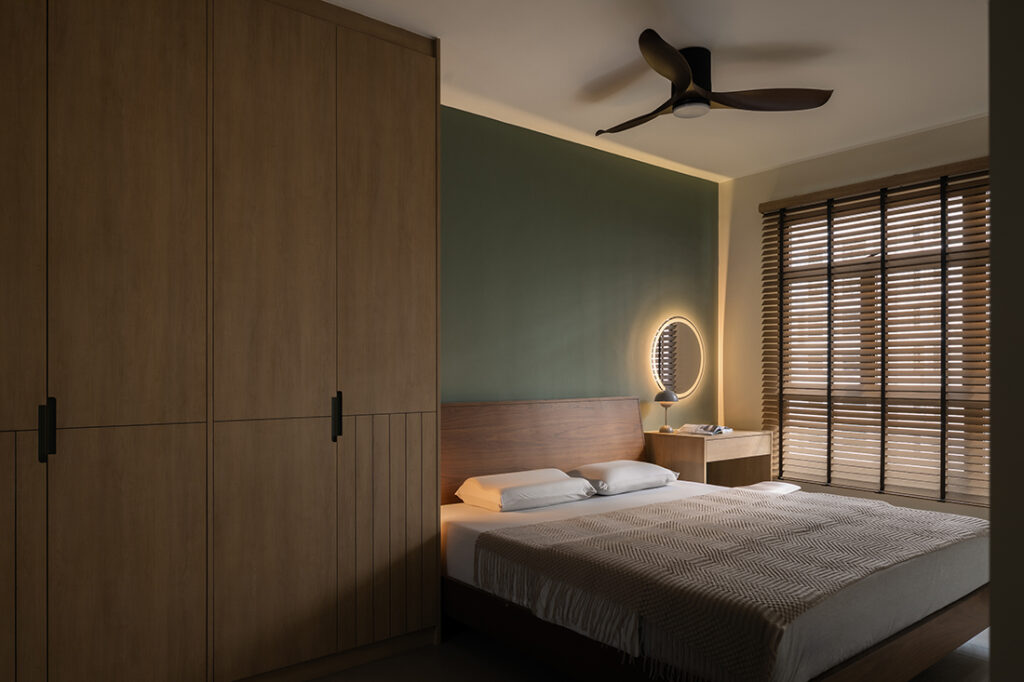 In the master bedroom, the brief for warmth and calm was met with a soft green feature wall paired with wood tones. Carpentry was kept to a minimum since storage needs were low, resulting in a serene, clutter-free space.