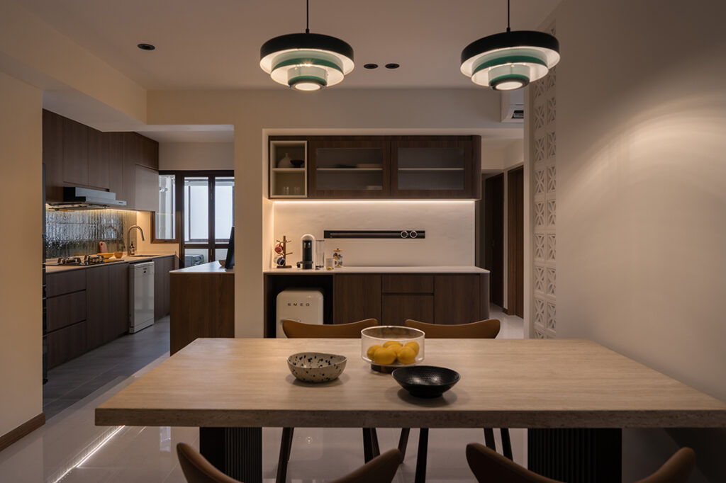 “As the unit is by the corridor, the homeowners wanted a divider at the entrance to provide privacy while keeping the house ventilated,” explains Daniel. Given the living room’s squarish layout, a solid wall would have made it feel smaller and less airy, so Daniel and his team used breeze blocks instead, which also double as the TV wall. To maintain visual continuity, the TV console was customised in a walnut finish to match the dining area, while light-toned walls quietly highlight the richness of the darker furniture pieces.”