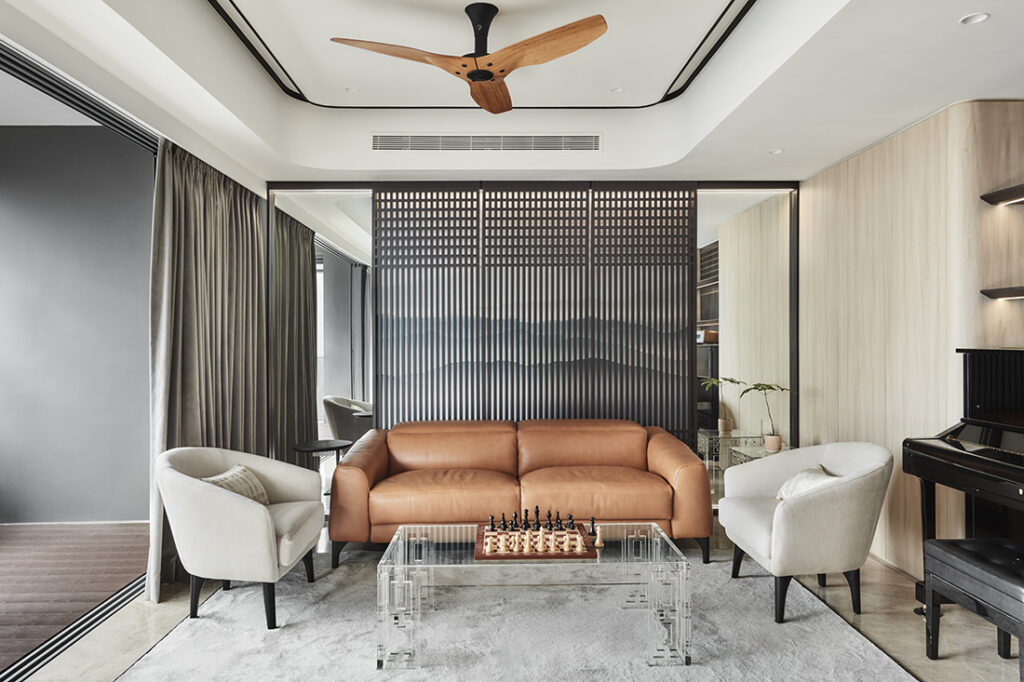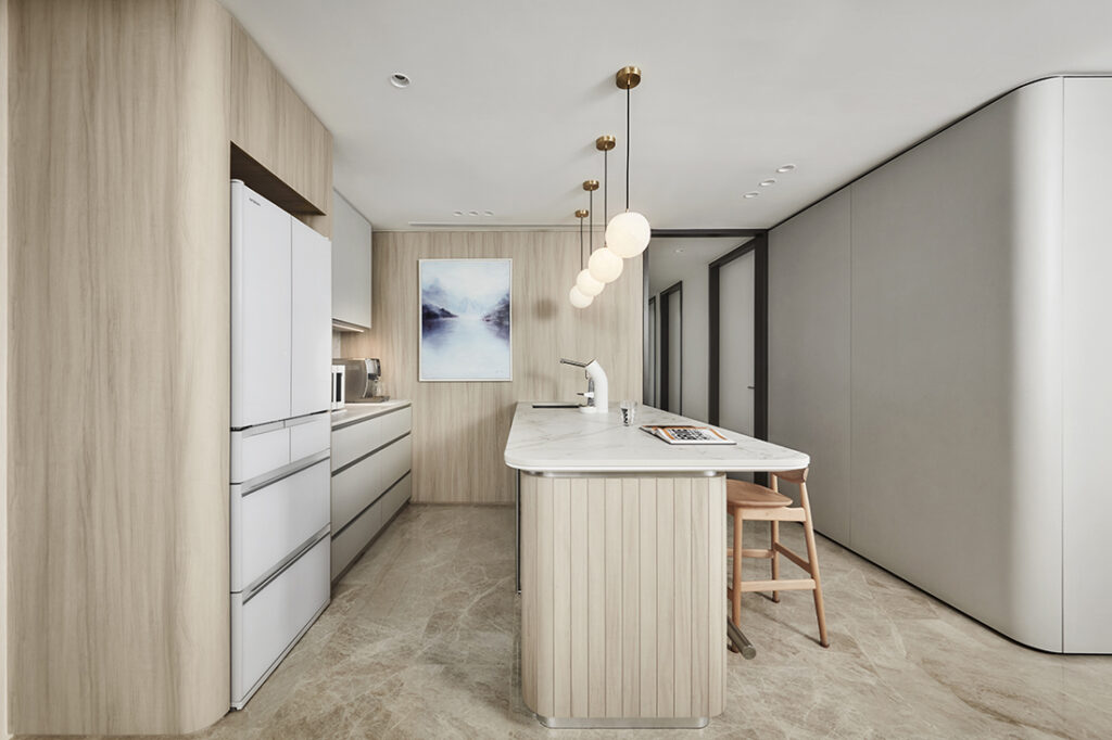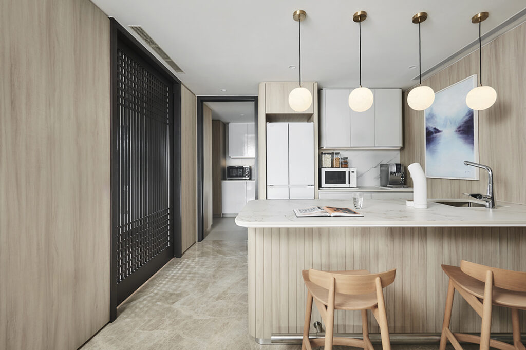 Referencing traditional Chinese folding screens, the layered form of the sliding door creates depth and casts soft shadows. As Lawrence explains: “When you come home, it should already feel calm, almost like a hotel lobby.”