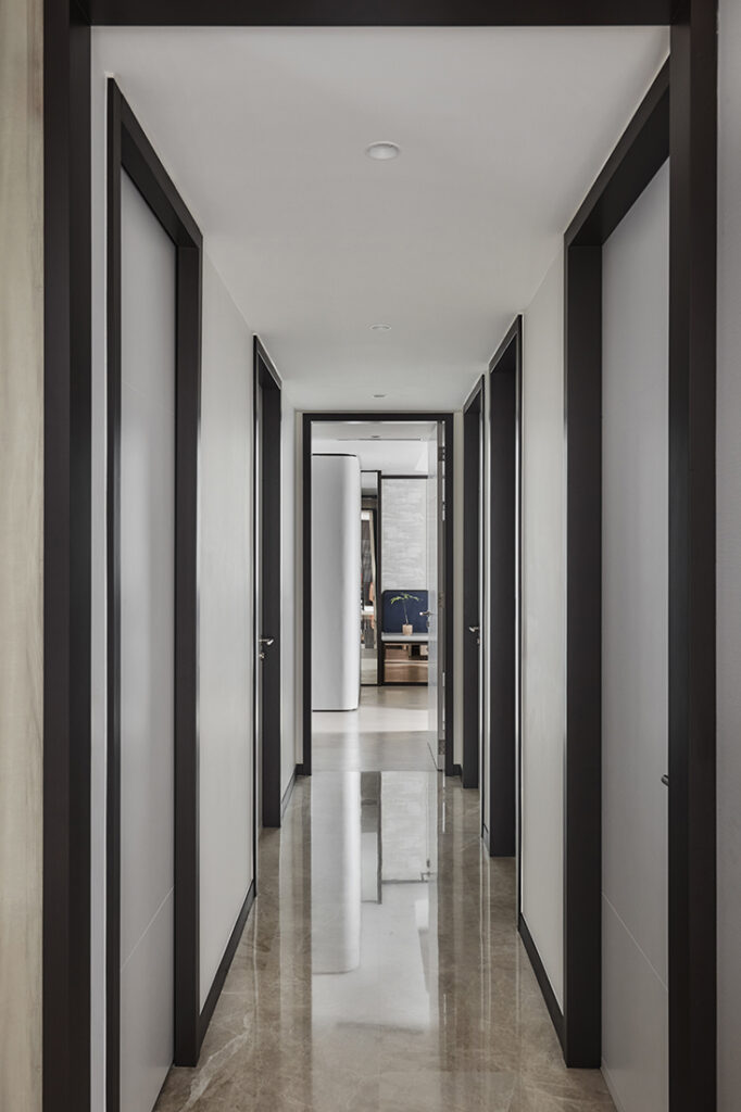 Along the corridor leading to the bedrooms, a consistent framing detail marks a clear transition from the home’s public areas to its private zones. Beyond this threshold, finishes become lighter and more restrained, easing the shift into the home’s quieter, more restful spaces.