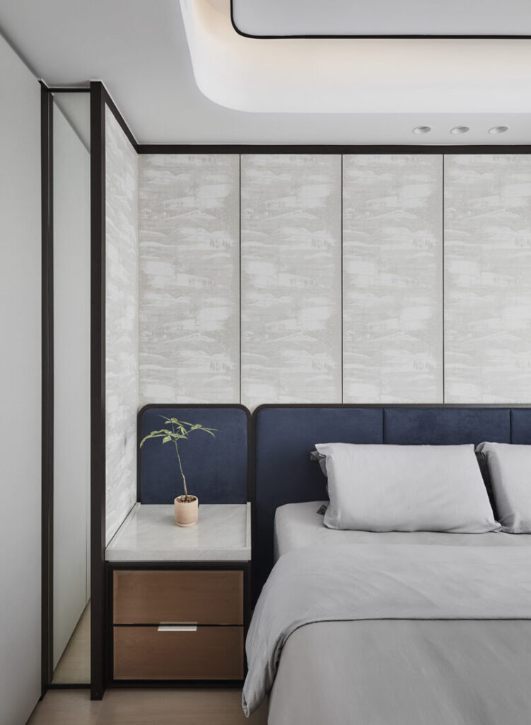 Designed to evoke a sense of calm and composure, the sleeping area is anchored by a custom headboard that reinterprets the screen motif through a series of repeating wallpaper panels. Below, sliding trays top the bedside tables, concealing electrical points within so plugs and cables remain easy to access when needed, and neatly tucked away when not in use.