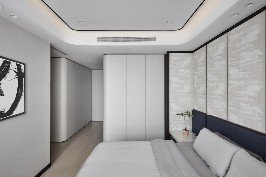 In the master bedroom, storage is enhanced through a focused addition rather than a full reconfiguration. A shallow row of wardrobes is introduced near the bed for folded items, with gently curved corners that soften the transition into the space, while hanging storage remains within the existing wardrobe.