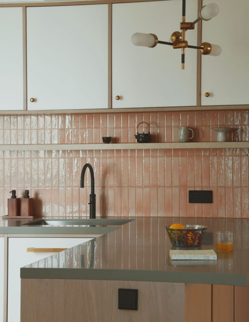 The walls of the living and dining areas are lined with handcrafted beige bricks from Krause Bricks, an Australian maker with a long history of artisanal production. The bricks have a subtle pink undertone that responds softly to daylight, creating a warm and settled atmosphere as light shifts across the space. Beyond their visual quality, the bricks speak to a broader interest in durability and longevity, offering strong thermal performance and a material lifespan measured in generations.