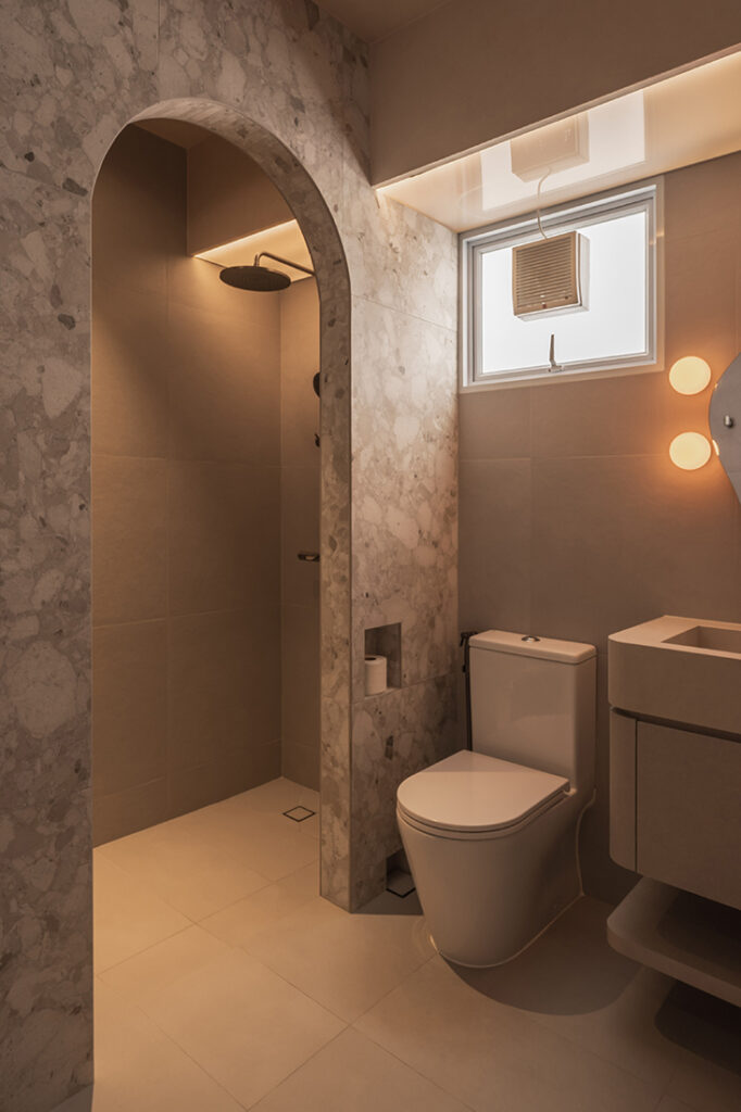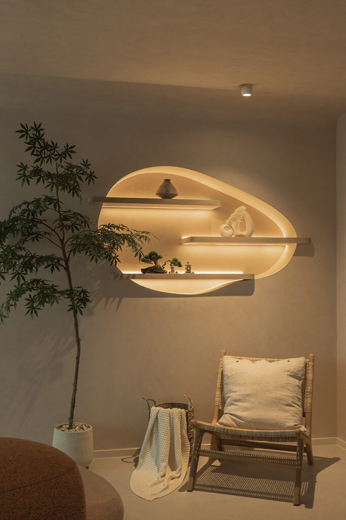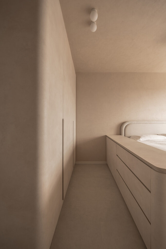Material selections reinforce the calm without flattening it. Soft wood tones sit alongside beige microcement laminates and indoor plants; Melmer Stone’s sintered surfaces define the kitchen countertop and backsplash as well as the integrated bathroom sink; and Hafary tiles and Rigel fittings ground the wet areas with durability. Even the dining pendants hover like folded fabric, echoing the sculpted lines on the walls.