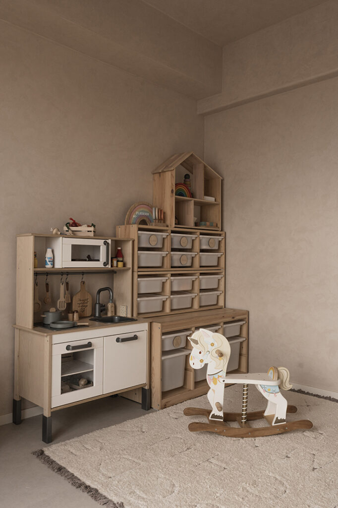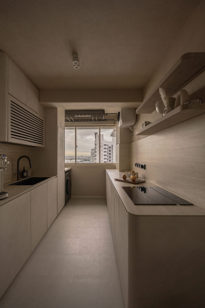 Organic gestures interrupt the grid of a typical HDB layout. In the living room, a pebble-shaped feature wall sits next to the television, while a large curved opening softens the threshold to the balcony. The kitchen entrance is edged in textured plaster, and made deliberately irregular — a tactile nod to wabi-sabi that moves the space beyond trend. “Wabi-sabi elements were highlighted at the kitchen entrance, where the rough edges accentuate the curved walls,” Vanessa notes. It’s an architectural gesture that subtly recalibrates the spatial rhythm of the home, easing the transition between dining and kitchen.