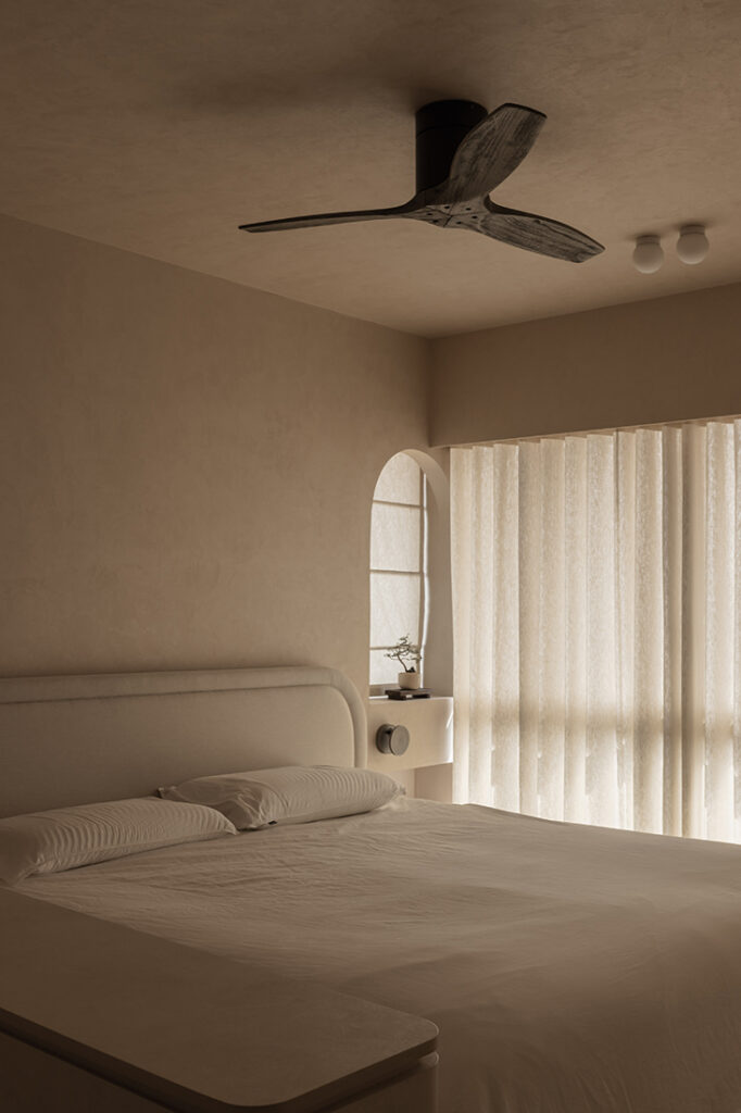 In this 1,238-square-foot resale flat in Bukit Batok, softness is not an afterthought — it is the architecture. Designed by Vanessa Chua for a family relocating for their daughter’s schooling, the five-room HDB has been recast as a beige-toned landscape of curves and texture. The brief was clear from the outset: “The key requirements leaned towards a Japandi style with wabi-sabi elements, and a beige-toned palette,” Vanessa shares. After years of living with industrial contrasts and electric blue accents, the homeowners were ready for restraint.