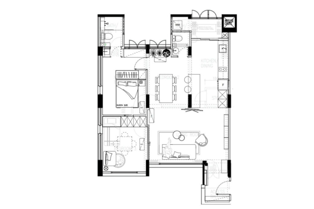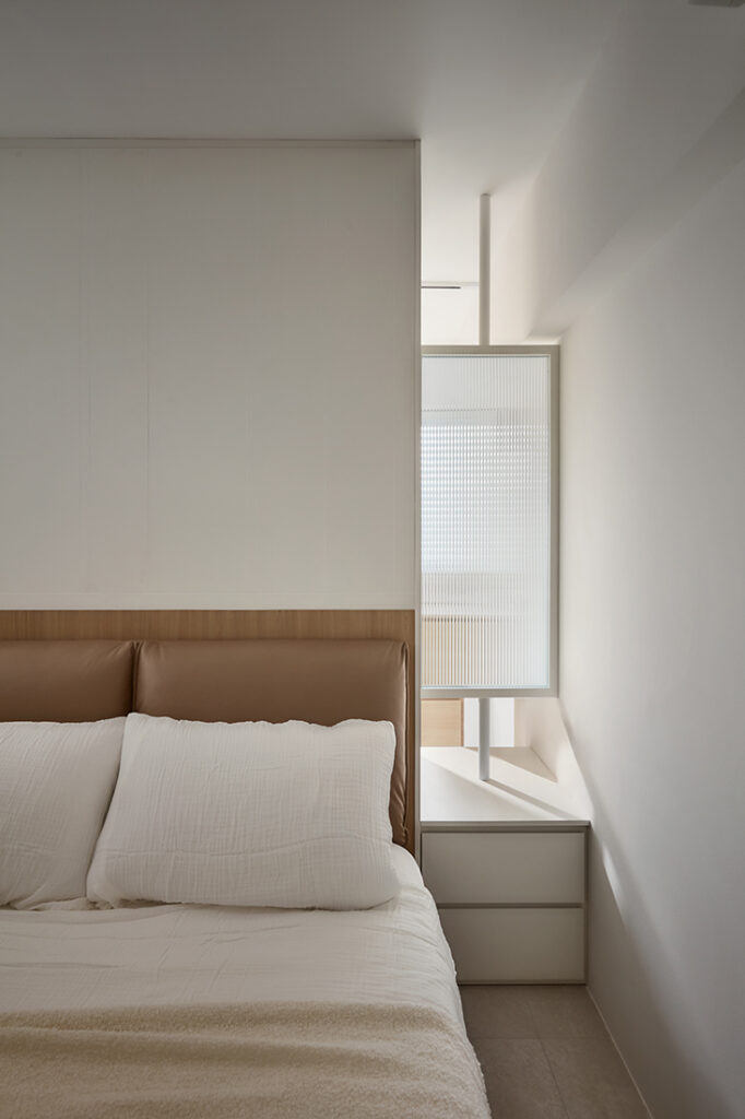 Next to it, the master bedroom has been redesigned for greater privacy and flow. Upon entry, a full-height wardrobe doubles as a wall divider that screens the sleeping area from view, while an adjacent fluted glass panel filters in soft daylight.