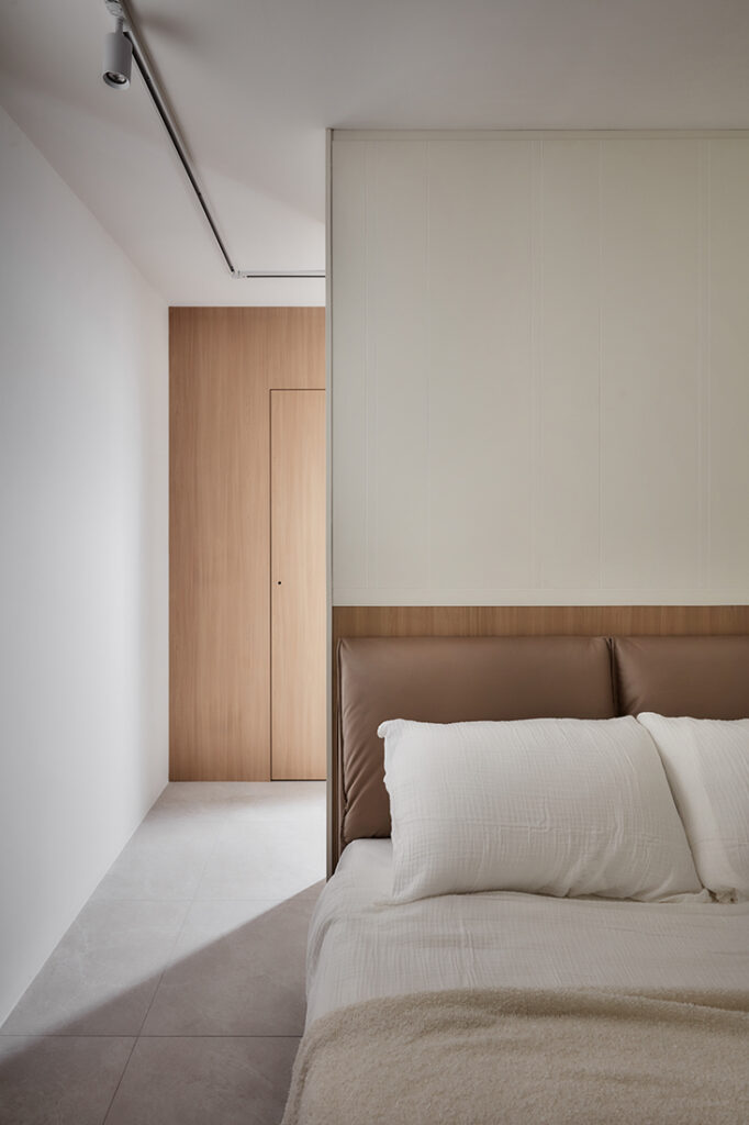 On the opposite side, the doorway to the master bathroom is neatly concealed within carpentry works. The entire arrangement balances storage with the need for natural light, while ensuring that the rest area remains a calm, cocoon-like sanctuary.