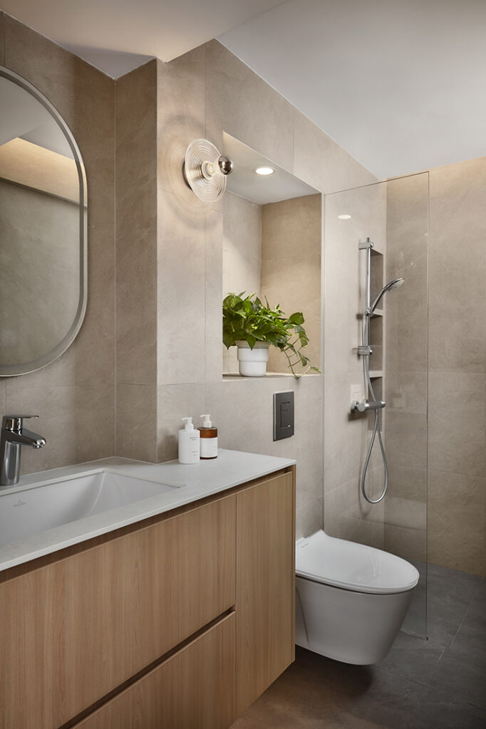 The master bathroom saw one of the most practical overhauls. A wall-hung toilet was introduced, and the shower was relocated to create a more efficient and relaxing layout. Layered warm lighting solutions and a false ceiling add to the sense of intimacy, transforming it into a cosy retreat.