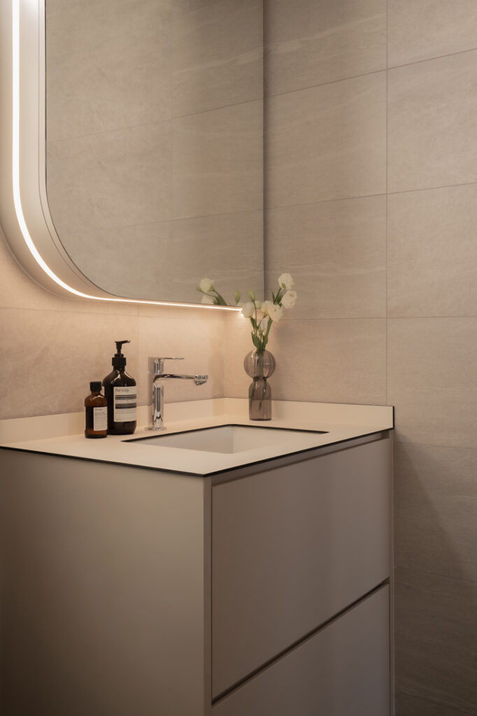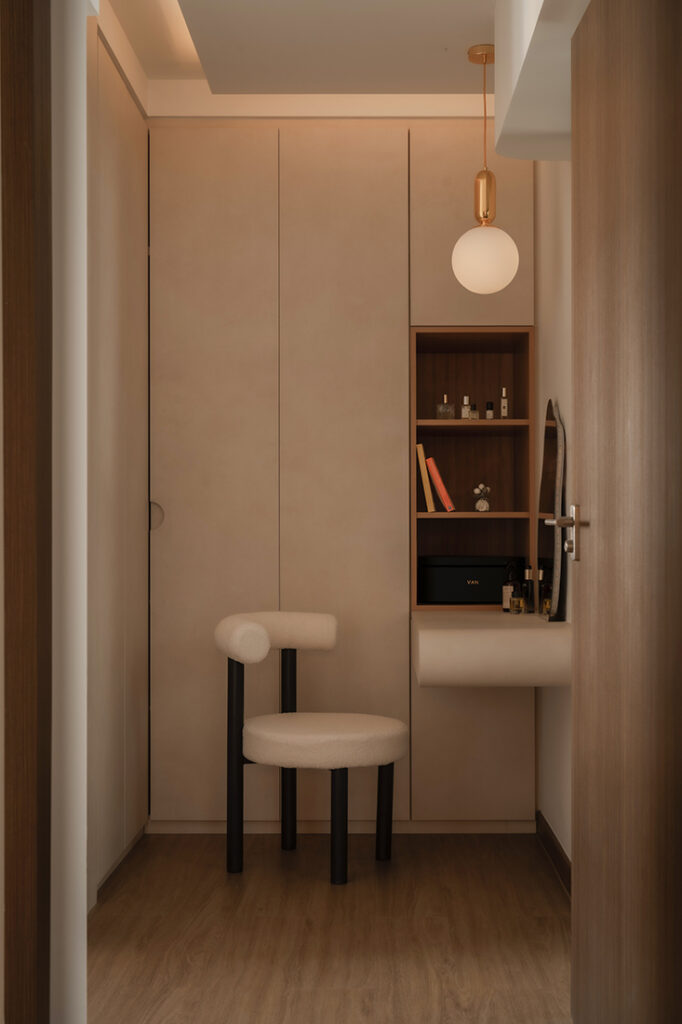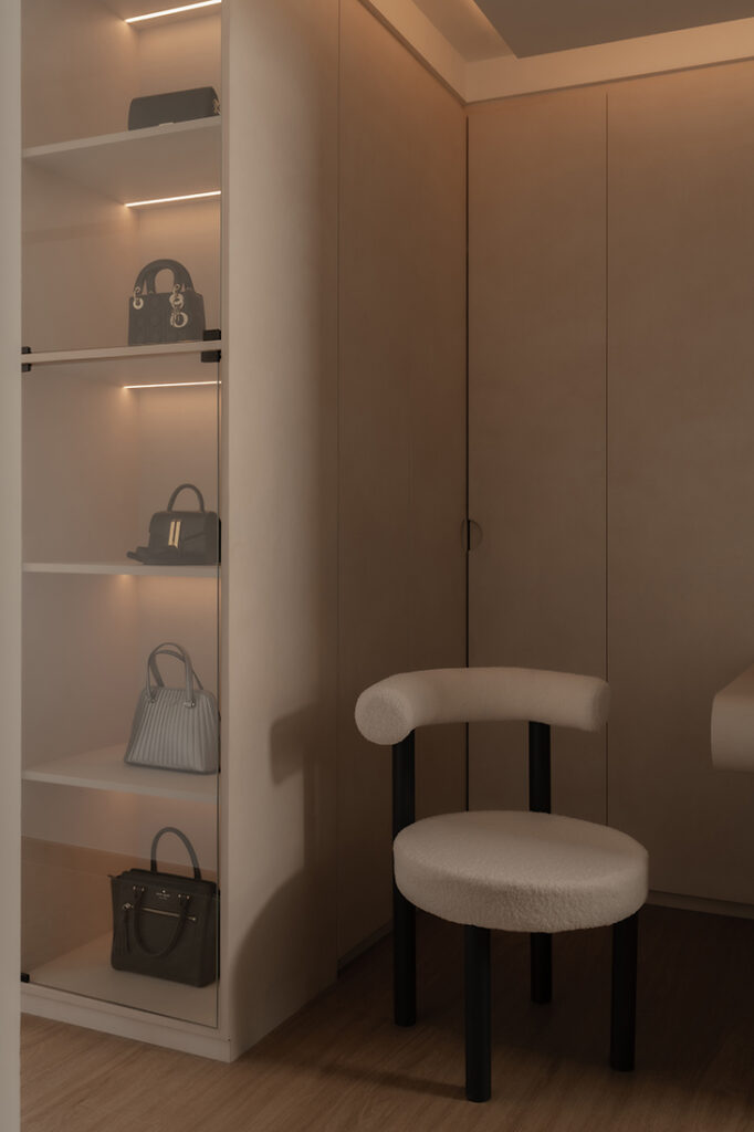 The private spaces mirror this same balance of function and finesse. In the master bedroom, Ray designed a boutique-inspired wardrobe suite with an illuminated bag display that turns everyday storage into a statement feature, and an integrated dresser with curves that evokes the intimacy of a private dressing room.