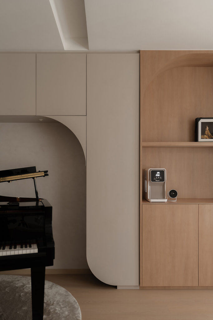 To bring their dream family home to life, designer Ray Seah from OVON was tasked with overseeing the renovation. “The homeowners are warm, family-oriented people who wanted a nurturing home to raise their newborn in,” Ray shares. He designed a modern Scandinavian home in warm beige tones and soft textures, with a custom piano nook that anchors the living area. “We wanted the piano to blend harmoniously with the living room so it wouldn’t feel out of place,” says Ray. “The cabinetry around it was customised together with the dry pantry to create extra storage for the homeowner’s music notes.”