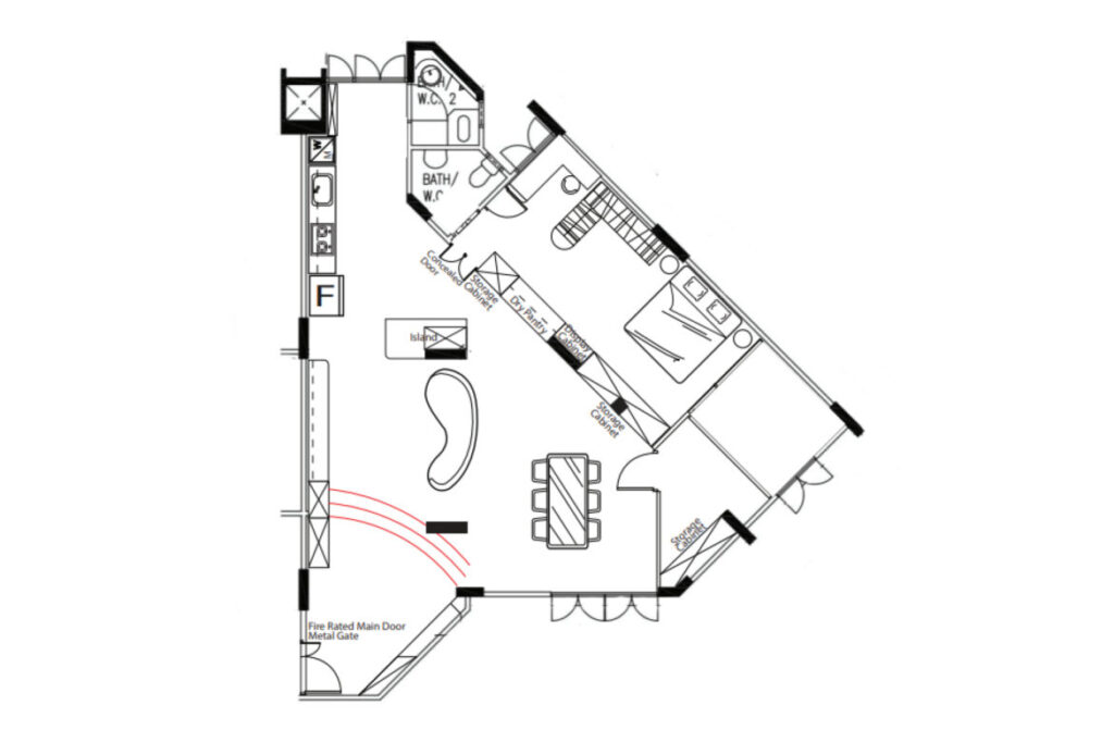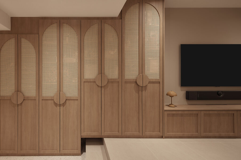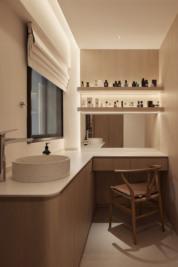Apart from an L-shape wardrobe, a vanity corner was also created, with two full-length ledges to display all of the couple’s perfumes. There’s even a mini cat door with soft closing hinges for the felines to come in through the living room.