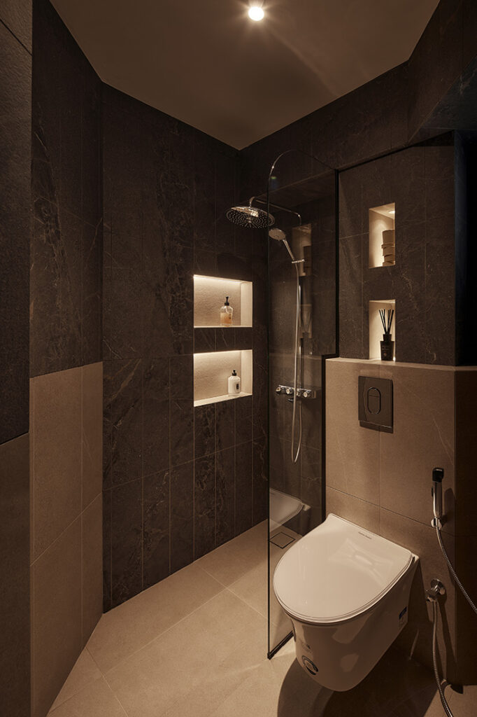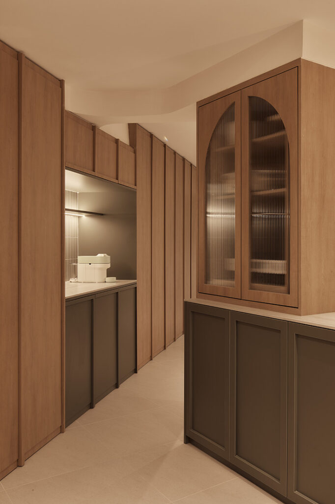 Because the couple doesn’t cook extensively, the kitchen takes a lighter touch — no bulky hood, just clean surfaces, and an extendable tabletop that slides out for baking or late-night steamboats.