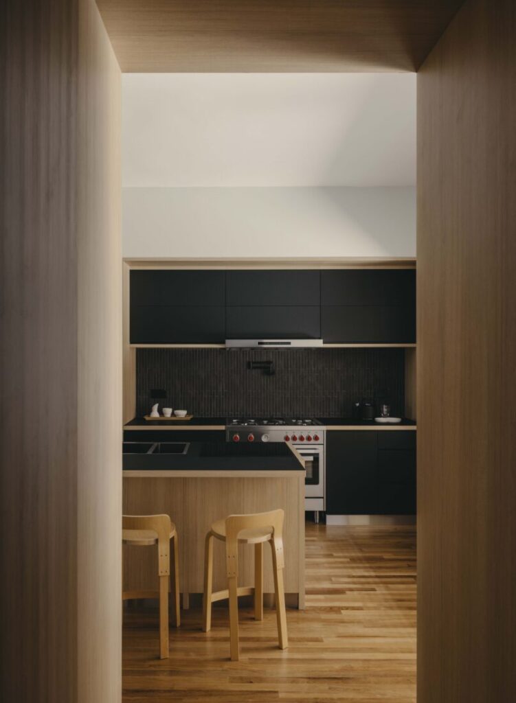The dining area merges with an open kitchen that has a gas stove for heavy cooking and an island counter for quick breakfasts. Black laminate and light timber for the joinery accentuate the mid-century modern vibe. “This area was designed to be flexible for the clients to host large parties with sufficient space for an extendable table and ample circulation of guests,” says Mikael on the plan.