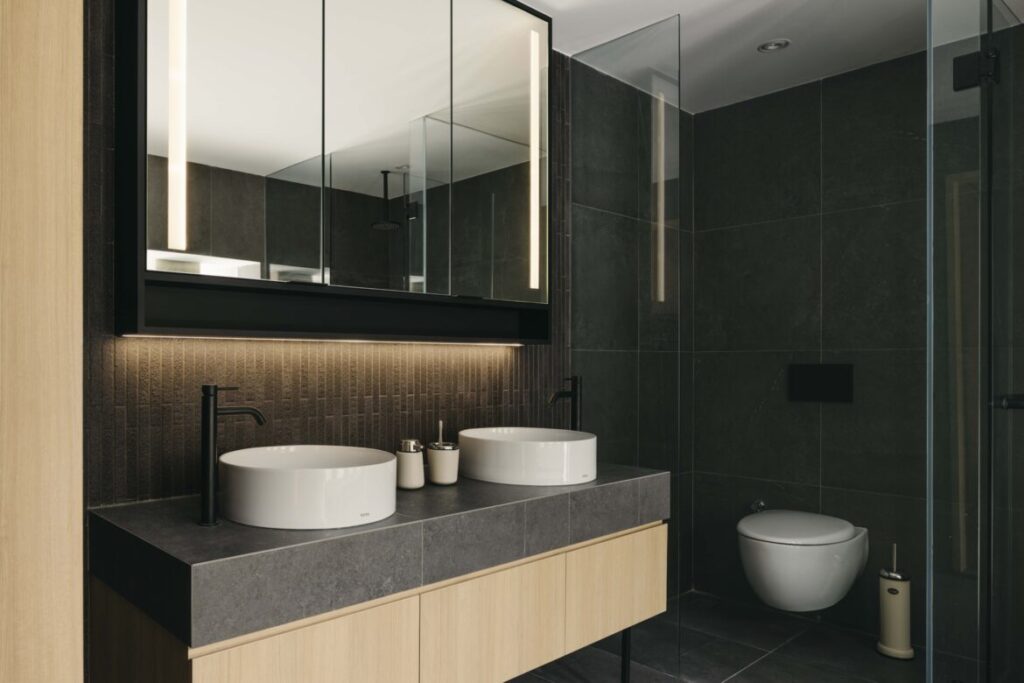 For the home’s palette, Mikael applied simple materials with soft tones. Light timber surfaces are accented with dark grey tiles in the master bathroom and corridor, adding a modern sensibility to the pre-war shell. The thoughtful selection of furniture and furnishings also contribute to the creation of a harmonious interior.