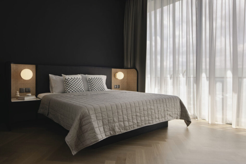 The private spaces turn warmer and moodier — veneers, rattan headboard details, herringbone oak underfoot — while the bathroom luxuriates in travertine. It’s a smart reframe: not a set piece of history, but a practical, contemporary home with heritage DNA.