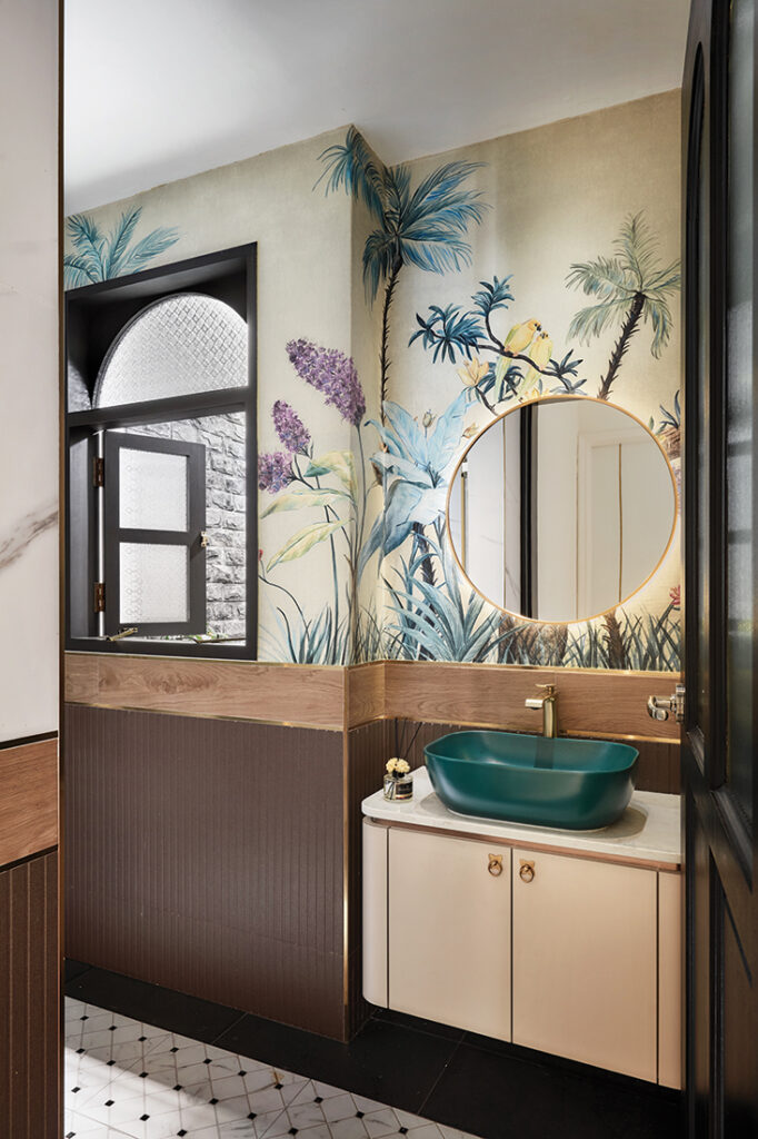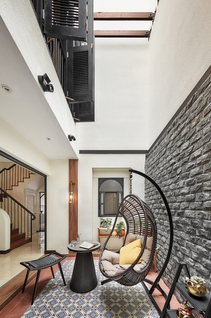 In this inter-terrace, AMP Design Co. goes for “colonial spirit, contemporary clarity.” A black-and-white base is layered with botanical motifs, rattan textures and warm timber —tropical, not stuffy. The design team reworks the plan with smart interventions (indoor bay window/foyer, air-well activation, loft insertion) to increase light and usable volume.