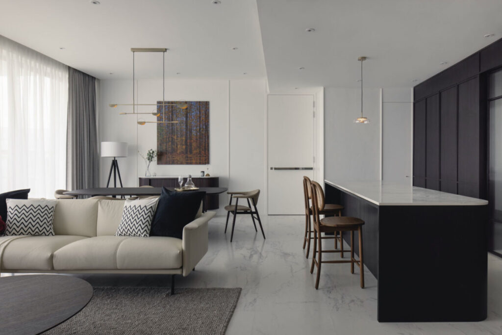 EHKA Studio channels the monochrome elegance of black-and-white bungalows into a high-rise context. Louvered and fluted-glass doors, rattan accents and crisp black-on-white contrasts deliver that colonial rhythm; uninterrupted marble flooring across the public zones creates a generous, gallery-like flow for hosting.