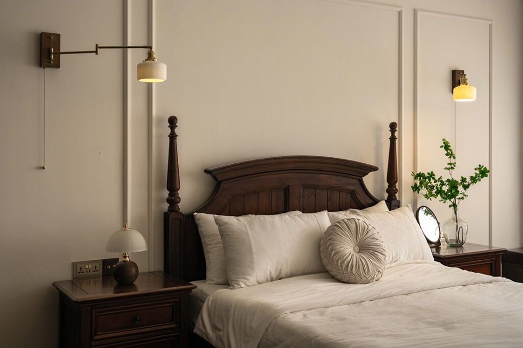 Details like arched wardrobe doors with fluted glass and brass accents bring a softly glamorous note without tipping into pastiche. It’s heritage handled with restraint.