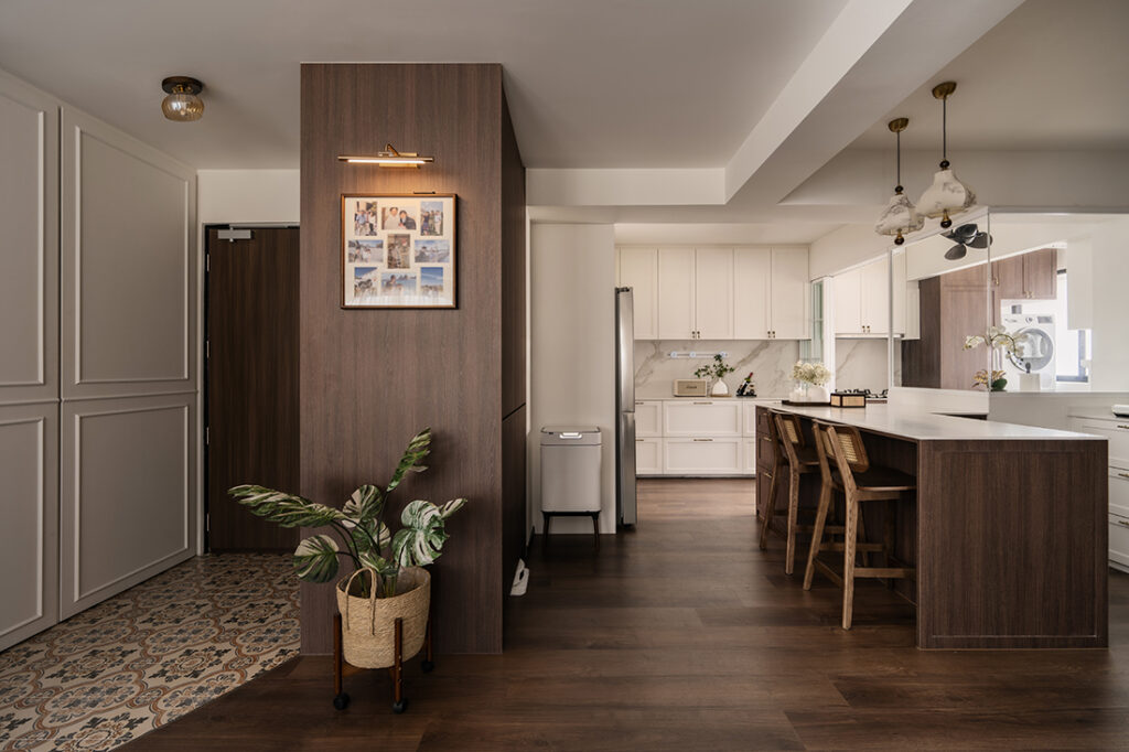 The Interior Lab translates black-and-white bungalow poise into a family-friendly HDB layout. Shaker doors, fluted details and a monochrome scheme bring structure, while an opened-up kitchen and connected living/dining keep the space nimble for two energetic kids. It’s modern classic with the edges softened for daily life.