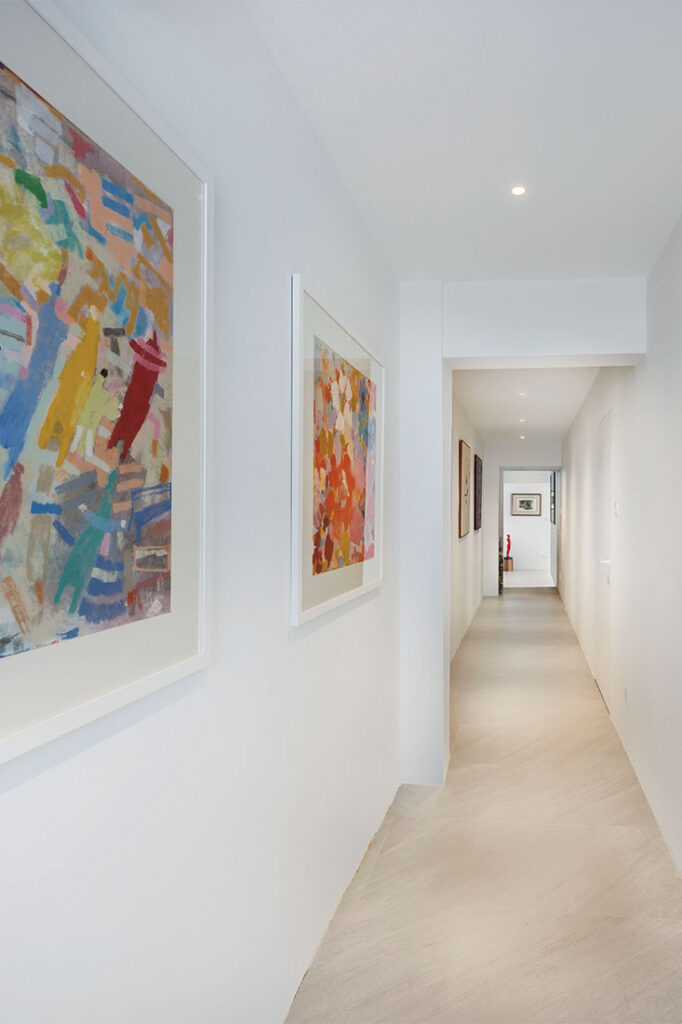 A neutral colour and material palette provides a clean canvas to elegantly display the homeowners’ prized art collection composed of abstract paintings and sculptures that they have amassed over the years. Leading towards the bedrooms, artworks line and colour the long corridor, making a mundane space come alive with warmth and character.