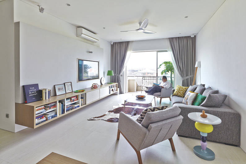 One of the biggest highlights of this Costa Rhu condo is the breathtaking view from the living room. The sliding glass doors open up to a view of the Singapore River and the Sports Hub, an inspiring sight that shouldn’t be hidden away by curtains or bulky furniture. In fact, the designers knocked down walls so you can enjoy the view whether you’re standing in the living room, dining room or even the kitchen. This had the added benefit of bringing light into the farthest corner of the home.