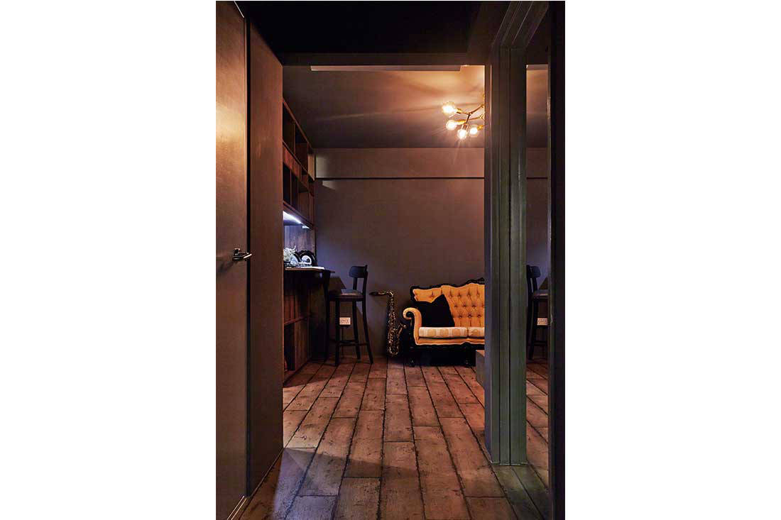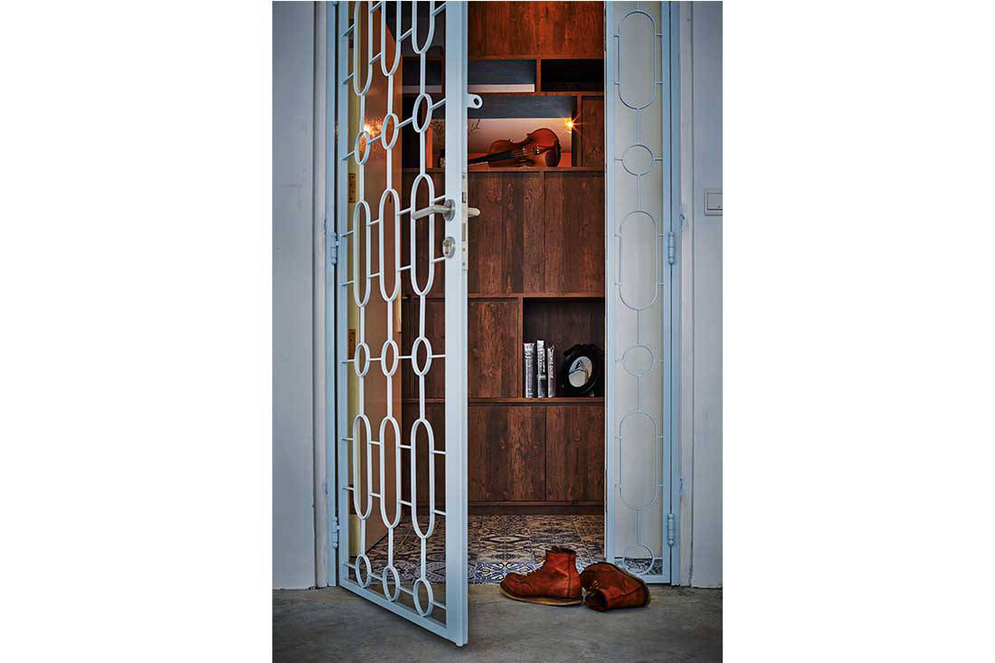 This flat makes a statement right at the door, where the main gate’s been fashioned after the design of window grilles from the ‘70s, and blue and white patterned tiles lead the way in.