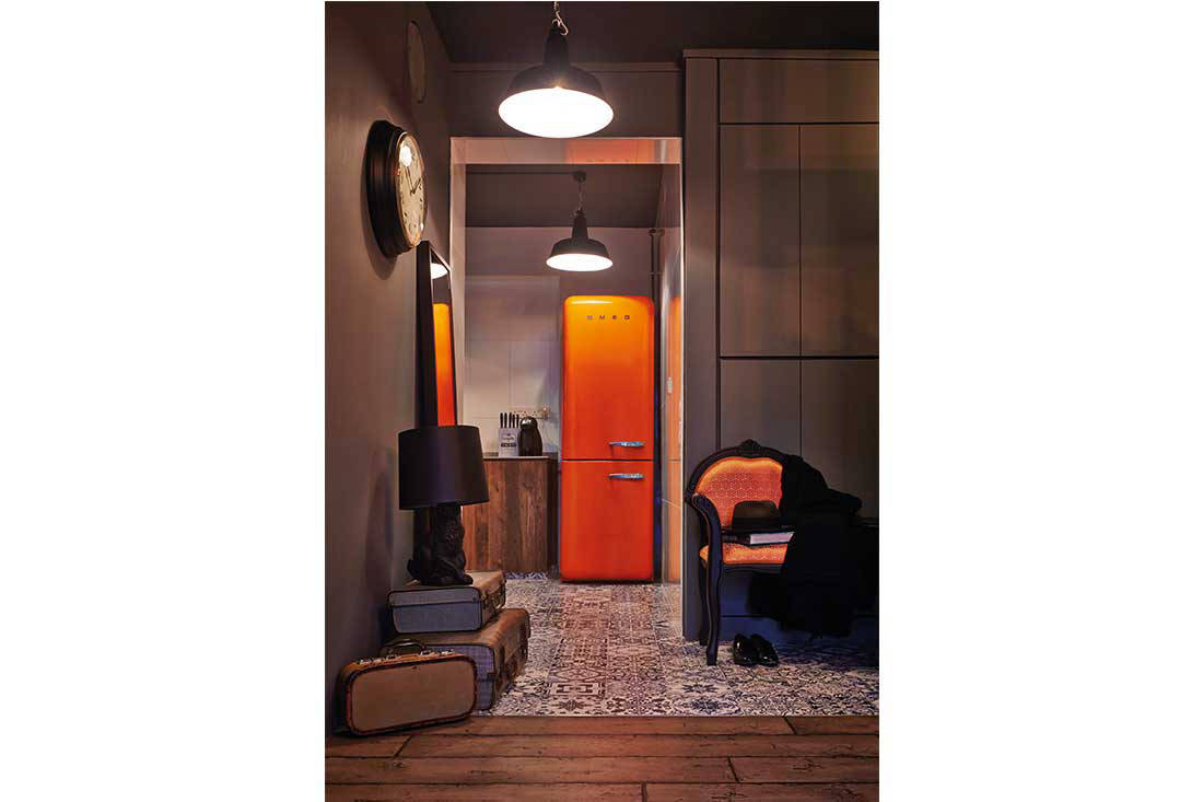 While the kitchen is decked in a subdued, neutral palette, the owners have jazzed up the space with a Smeg refrigerator in a bright shade of orange that adds a refreshing twist to the flat’s overall dark and masculine vibe.