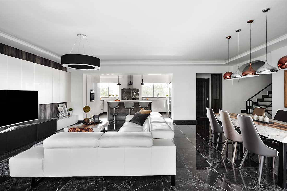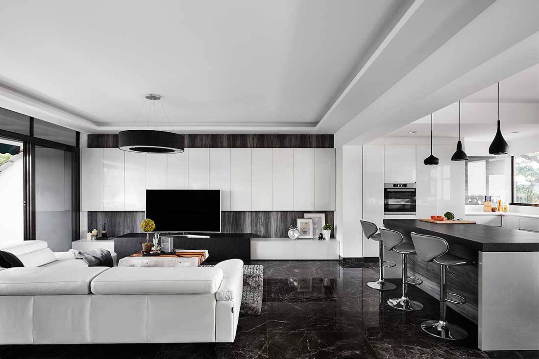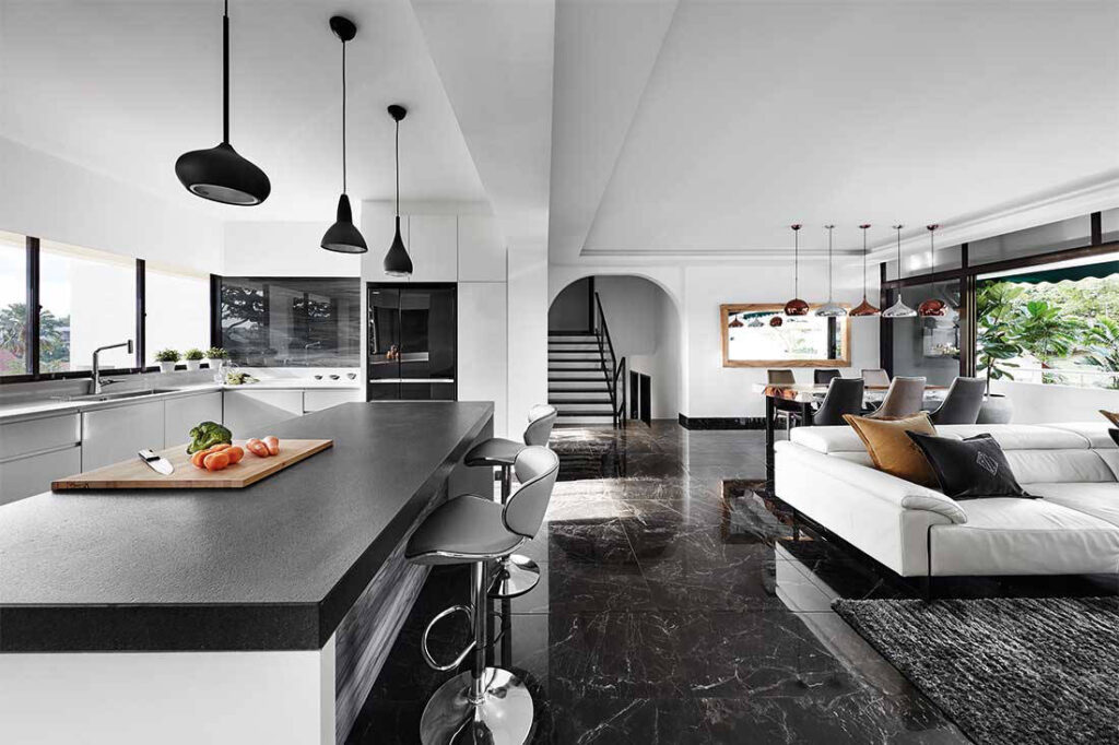 The dark marble flooring transitions smoothly to a similarly coloured tile in matt finish in the kitchen – to enforce a subtle differentiation of the different zones whilse ensuring a seamless visual connection between the spaces. In addition, the wife desired an island in the open-plan kitchen, and for it to be made of a ‘unique’ material. Lawrence fulfilled this request by constructing the countertop in black granite finished in leather.