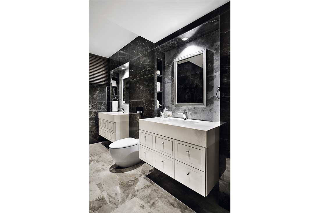 Carrying the same hotel-inspired look, the master bathroom has been entirely reconfigured and enlarged such that it now can accommodate his and hers vanity counters.