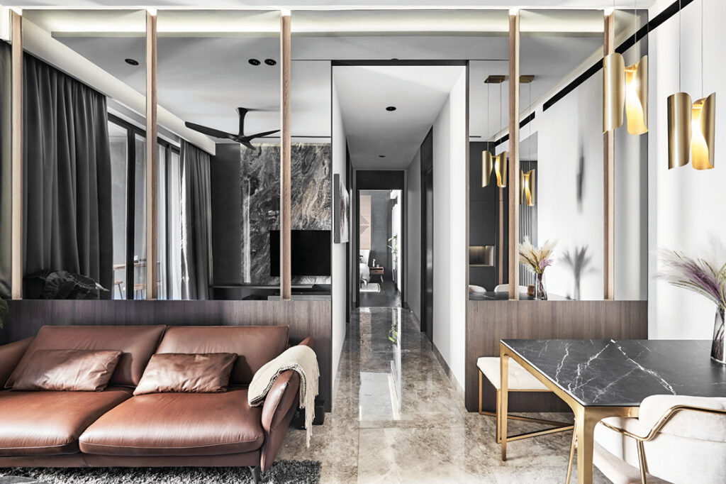 The mirror feature wall effectively doubles the visual expanse of the dining area and emphasises the high ceiling. The Obbio Concept designers also incorporated luxurious stone into the design to go with the posh ambience, and it takes form in the marble dining table.