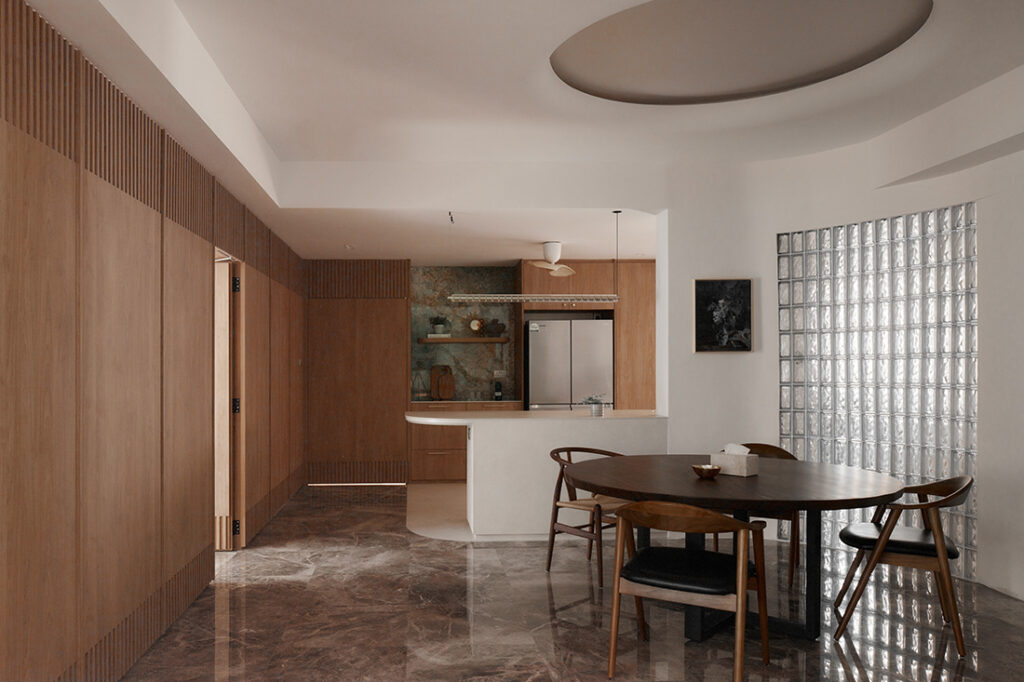 At the heart of the redesign is the dining area, envisioned as the highlight of the home. Here, a curved glass block wall diffuses natural light, while recessed shelving and a circular ceiling detail highlight the home’s gentle curves. The zone extends seamlessly into the dry kitchen, where a rounded-edge kitchen counter topped with a durable Neptune surface from Melmer creates a smooth transition between dining and food preparation.