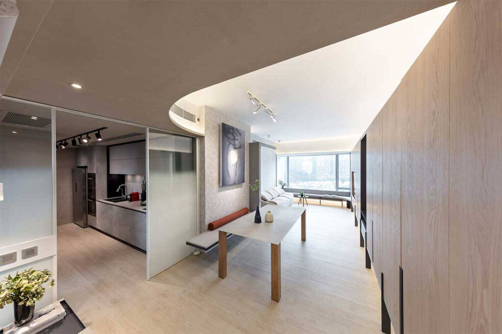 Overhead, a curved false ceiling extends from the foyer to conceal structural beams and air-conditioning units – minimising clutter in one fluid stroke.