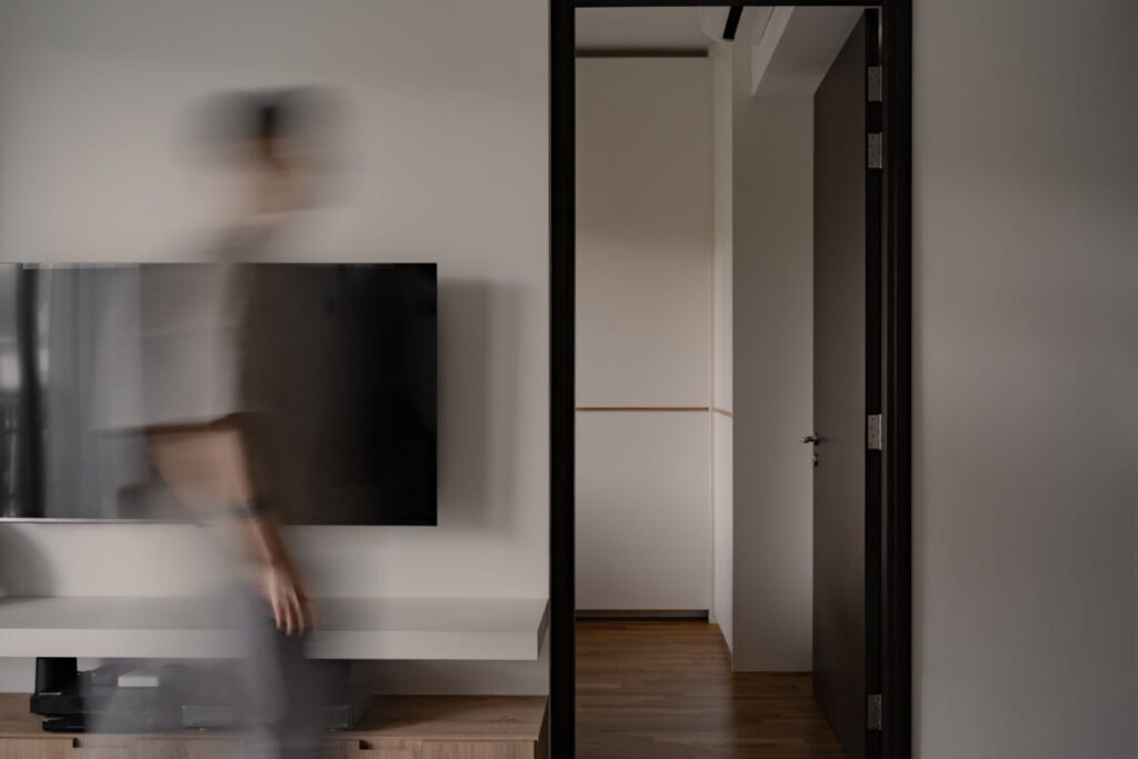 To this end, a lot of thought has gone into designing the spaces with consideration for the homeowners’ lifestyle. This is evident right from the entry into the unit, where the built-in cabinetry used as shoe storage is designed with minimal hardware and clean lines. At the same time, a simple settee with a wall-mount tinted mirror is strategically constructed near the entrance as part of the carpentry. arche° has also turned the suggested study area into a dry pantry adjacent to the shoe cabinet to maximise the amount of storage.