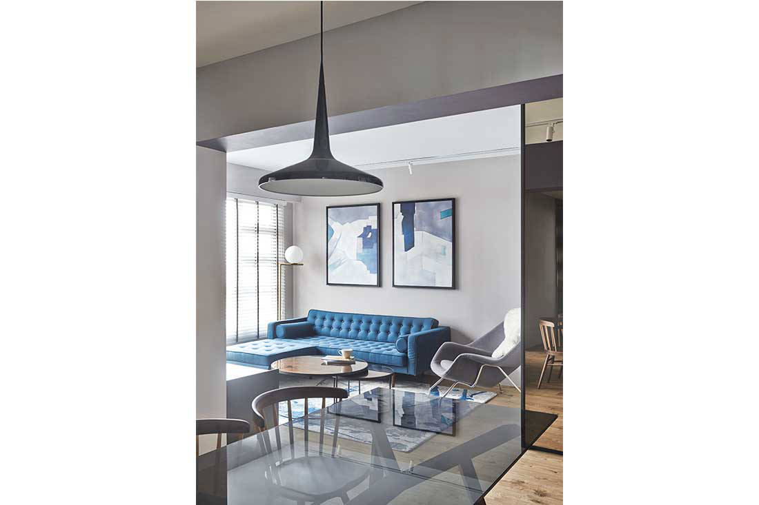 The living area leads into the dining area and from here, a passageway brings one to the bedrooms. To enhance the space, Joey used wall sconces to add controlled washes of light to the walls. He also gave attention to line work, creating dark outlines on doorframes, artworks and the full-height storage units.