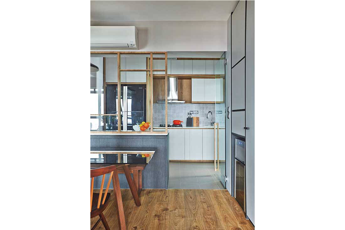 While the owners wanted an open-concept home, they were concerned that cooking fumes from the kitchen would permeate the flat. To address this, Joey created timber-framed windows in place of solid walls. He also played with three colours – dark wood tones, light grey and off-white, and added more texture to the overall vignette with patterned tiles as the backsplash.